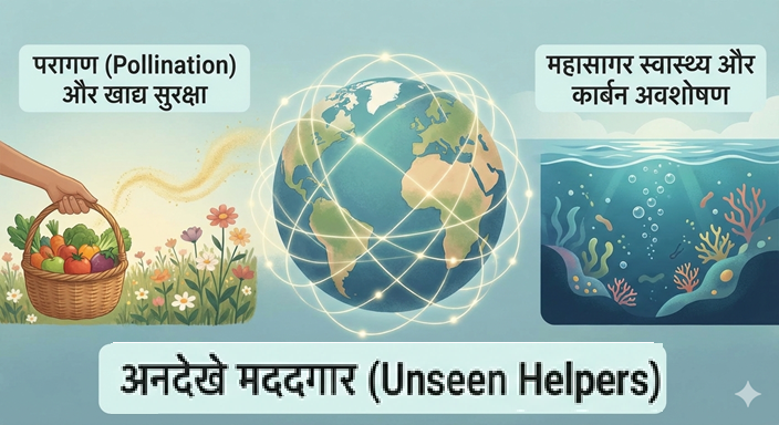 अनदेखे मददगार(Unseen Helpers) -मधुमक्खियों से लेकर व्हेल तक, हर जानवर हमारी दुनिया के लिए क्यों ज़रूरी है | हम अक्सर मानवीय नवाचार—हमारे स्मार्ट शहरों, उन्नत प्रौद्योगिकी और औद्योगिक ताकत का जश्न मनाते हैं। लेकिन इन उपलब्धियों के नीचे एक मूक, प्राचीन साझेदारी छिपी है जो हमारे अस्तित्व को संभव बनाती है। हम अकेले काम नहीं कर रहे हैं। हमें पृथ्वी पर सबसे महत्वपूर्ण नौकरियाँ करने वाले गैर-मानव कर्मचारियों के एक वैश्विक कार्यबल द्वारा उठाया जा रहा है। वे मास्टर परागणकर्ता, जलवायु इंजीनियर, वन आर्किटेक्ट और समुद्र के संरक्षक हैं। इससे पहले कि हम अपनी पीठ थपथपाएं कि हम चीजें कैसे पूरी करते हैं, हमें यह पूछना चाहिए: वास्तव में काम कौन कर रहा है?