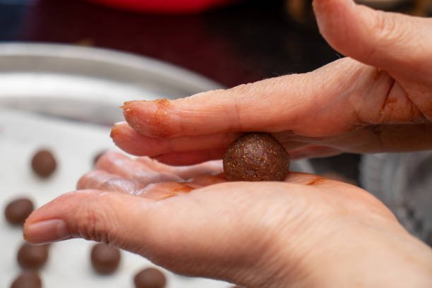 6. मिश्रण का एक छोटा सा हिस्सा लें, अपनी हथेलियों को चिकना करें और इसे एक चिकनी गेंद के आकार में ढाल लें।