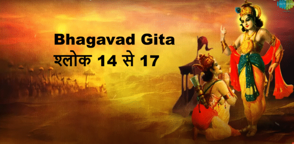 भगवद गीता अध्याय 1 श्लोक 14 से 17 – पिछले श्लोकों (1.10-1.13) में हमने देखा कि कैसे कौरव सेना की ओर से भीष्म पितामह के शंखनाद के बाद समस्त कौरव योद्धाओं ने अपने-अपने शंख और वाद्य बजाकर युद्ध की घोषणा कर दी। वह ध्वनि इतनी भीषण और गगनभेदी थी कि पूरा वातावरण युद्धमय हो गया।